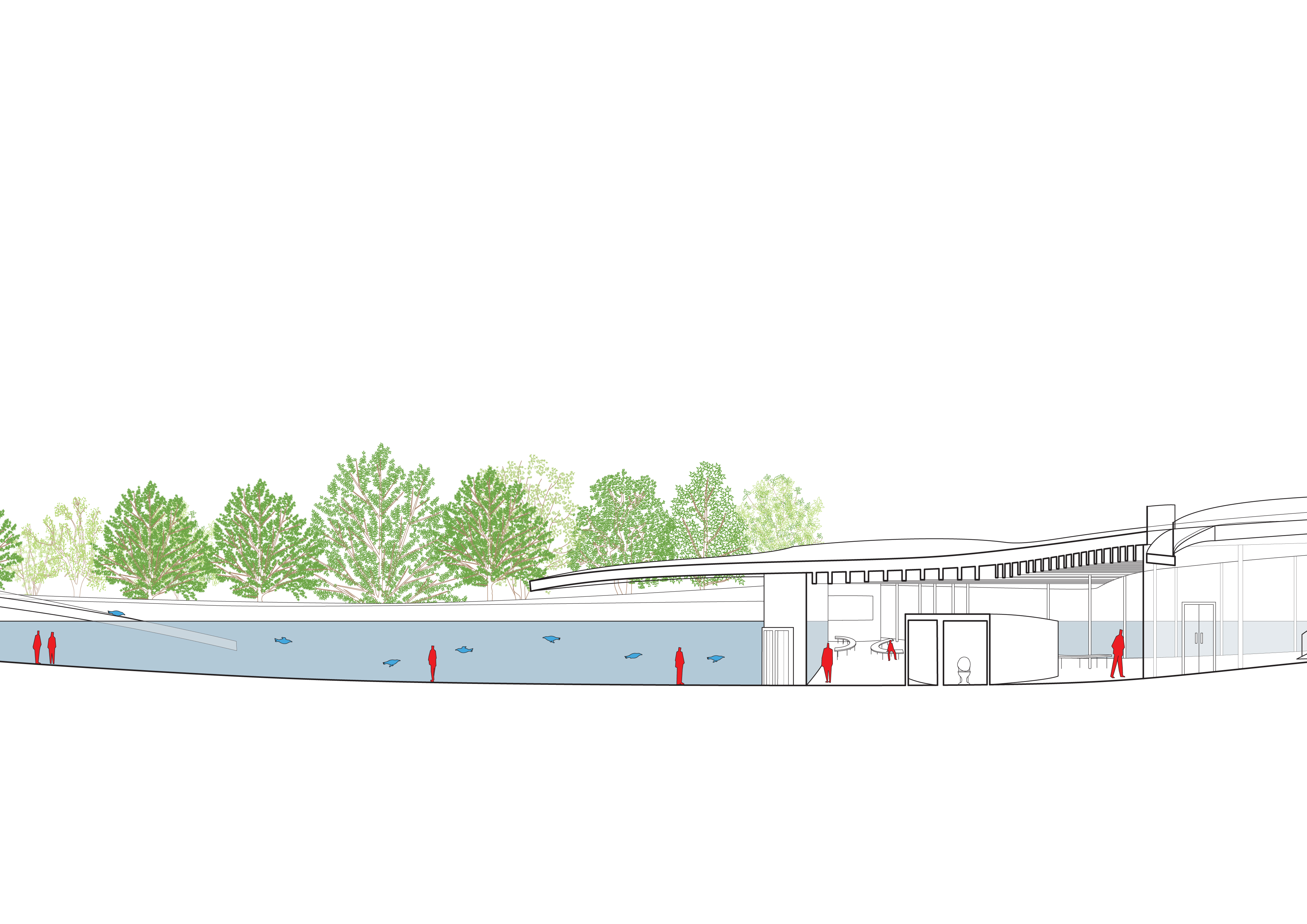 The abstract of this studio was to propose a new animal enclosure for the Hongshan Zoo in Nanjing, which itself is a segmented piece of nature in the heart of the city. We chose the Mangelic penguins as we were intrigued by the parallel between how they traverse sociologically between amphibian habitats and how humans occupy the cityscape to recreate and work. Given that the site parcel is an edge condition between the city and nature, we wanted to leverage it as an interface of interhuman, interspecies, and interurban transactions. Schematically, the project serves as a tangential line that bifurcates the 2 penguin habitats where human programs occur. These pathways delayer into ann enclosed route for the zoo and a route that bleeds back out into the city, linking the station, the zoo, and the new plaza/mall complex. The boundaries modulate to allow for ambiguity between human and nature, with a bridge that literally links the 2 penguin habitats transgressing an amphitheater, allowing for the daily ritual of migration to devolve into a spectacle for human (and in a more morbid criticality, for penguin) consumption. Pockets of interior programs and sunken courtyards also provide nodes for collectivity, as well as vertical circulation that punctuate moments of sporadic entry and exit points between the zoo and urban routes.